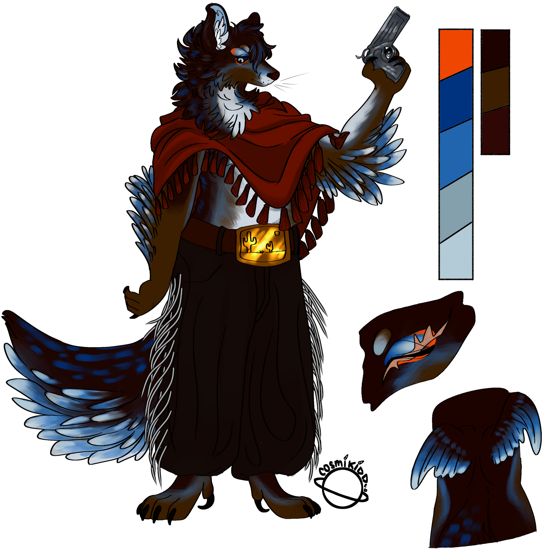 includes front and back view, central posed character, color palettes, and character info